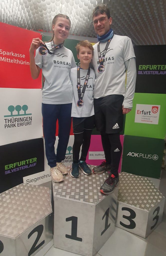 So hoffnungsvoll, wie das neue Jahr begann, so erfolgreich endete das alte. Für den 6. Dezember hatte die laufbegeisterte Familie Schmied aus Henningsleben offenbar das Podest gemietet. Über die 4-km-Distanz des Erfurter Silvesterlaufes kam Lucie nach 14:21 Minuten zum zweiten Mal nach 2024 als schnellste Frau des gesamten Feldes über die Ziellinie. Ruben belegte Rang 3 in der U 14-Wertung. Papa Torsten wollte seine Kinder nicht alleine „da oben“ stehen lassen: Er legte unterwegs einen Zahn zu und durfte als Dritter seiner Altersklasse ebenfalls aufs Treppchen klettern.